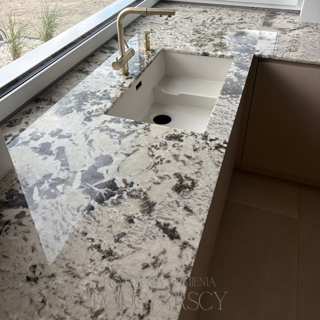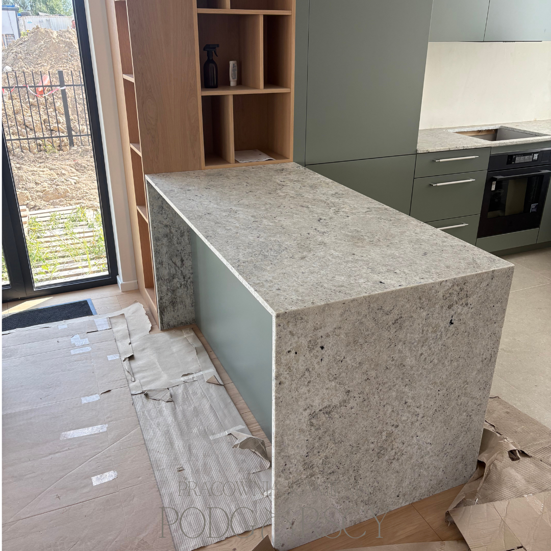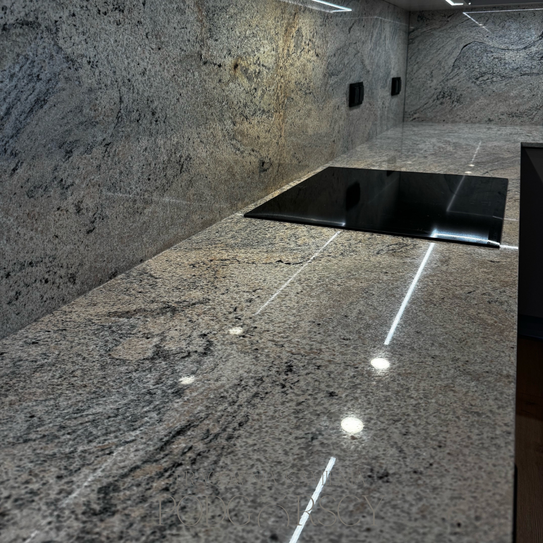 Granit jest odporny na wysoką temperaturę, zarysowania i wilgoć, dzięki czemu idealnie sprawdza się jako blat kuchenny, łazienkowy lub element wykończenia wnętrz premium.